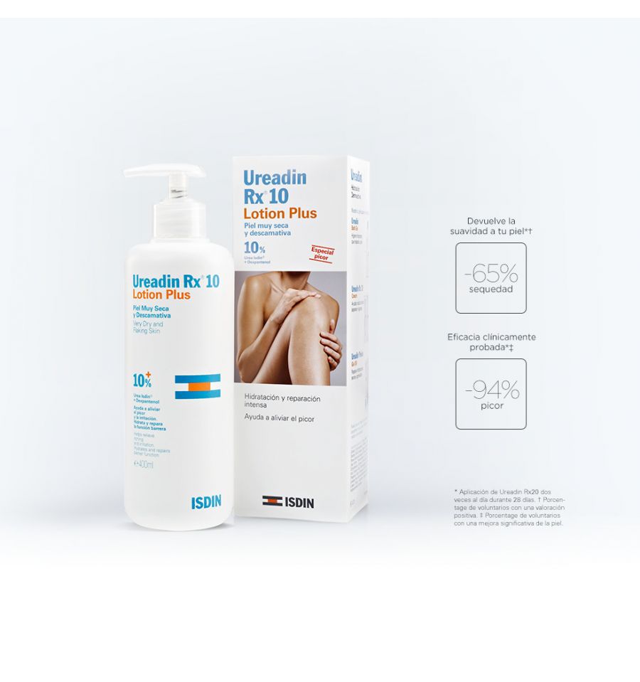 Loción con UreaIsdin al 10% indicada como tratamiento coadyuvante reparador en las alteraciones de la función barrera (ictiosis, xerosis, piel senil, descamación, alteraciones cutáneas por rascado y prurito por deshidratación). Ayuda a aliviar el picor y la irritación e hidrata intensamente gracias a su composición también con Dexpantenol.